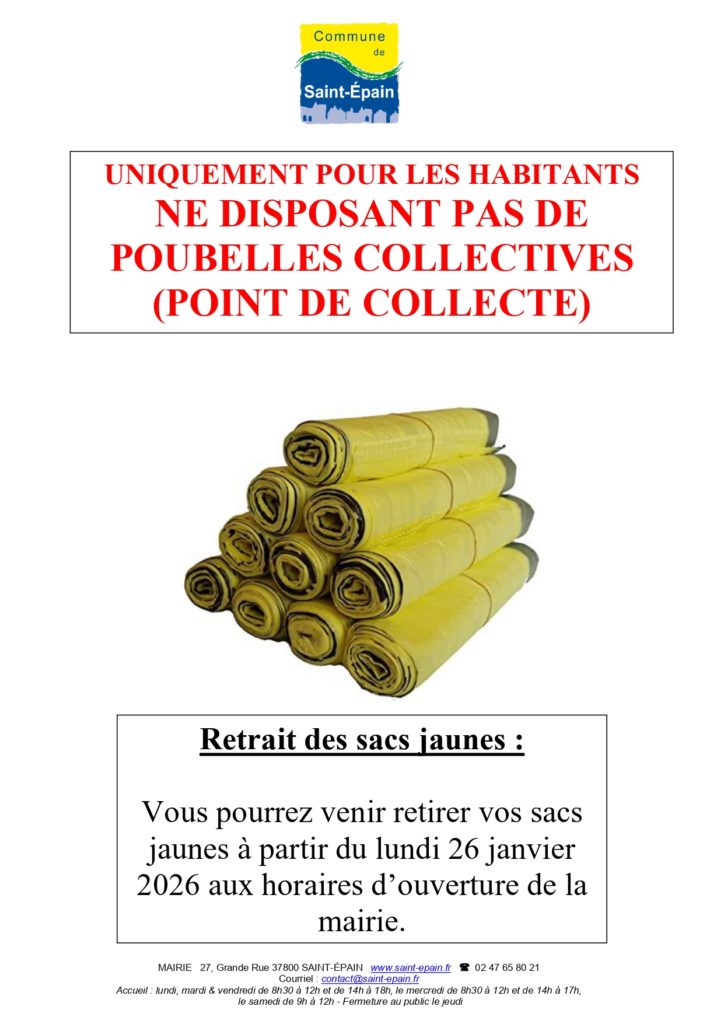 Actualités Changement de prestataire SMICTOM Retour Commune de Saint-Épain > Vie municipale > Retrait Sacs Jaunes Retrait Sacs Jaunes