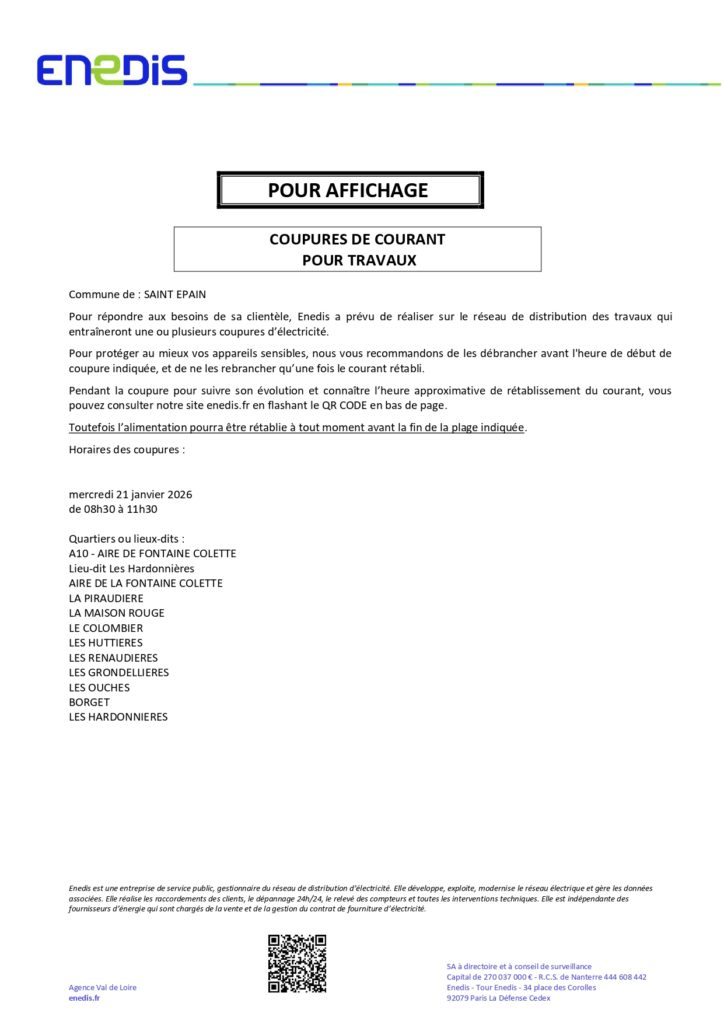 Vous trouverez ci-joint les coupures d’électricité programmées sur la commune classées par ordre chronologique.