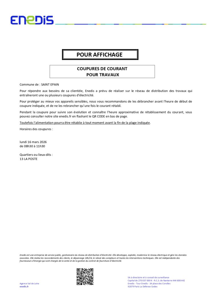 Vous trouverez ci-joint les coupures d’électricité programmées sur la commune classées par ordre chronologique.